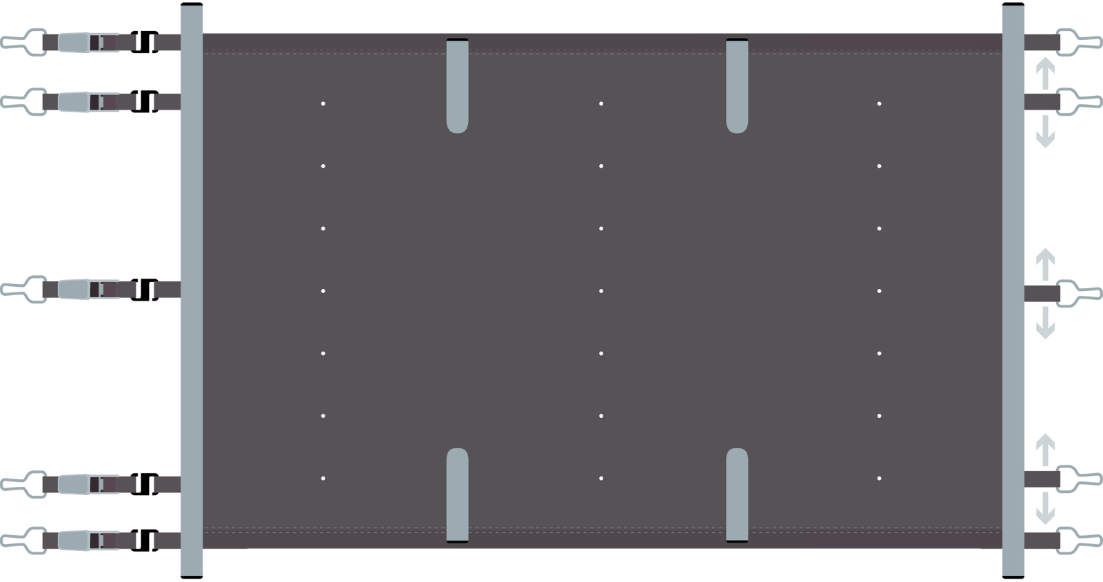 Les sangles d'accrochages du coloris assorti à la bâche sont réglables sur la largeur pour vous faciliter l'installation et la mise en place.